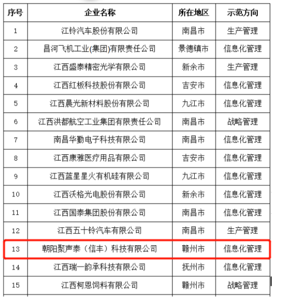 近日,江西省工業(yè)和信息化廳在其官網(wǎng)發(fā)布了《關(guān)于公布2021年度江西省管理創(chuàng)新示范企業(yè)認(rèn)定名單的通知》(贛工信企指字〔2022〕42號(hào))。朝陽(yáng)聚聲泰(信豐)科技有限公司入選2021年度江西管理創(chuàng)新示范企業(yè)名單。