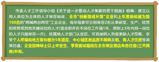 市委人才工作領(lǐng)導(dǎo)小組和市工信局聯(lián)合發(fā)文,明確了2020年度具備自主舉薦人才資格的企業(yè)名單,我公司為2020年度“兩型企業(yè)”創(chuàng)新型成長(zhǎng)型企業(yè),享受自主舉薦2名人才資格,經(jīng)屬地人才部門(mén)認(rèn)定,可直接納入繼續(xù)緊缺人才范湊。